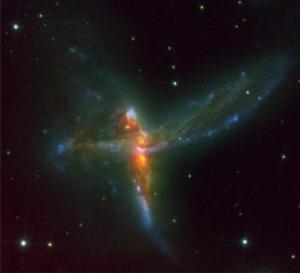 The ghostly bird measuring 100,000 light years across. It is in fact a collision of galaxies 650 light years away. Involving two spiral-shaped galaxies and a third irregular mass of stars, the event was caught by the infrared camera of the European Southern Observatory's telescope in Chile. The bird's head, formed from one of the galaxies, is tearing away from its body at 400 km (250 miles) per second. Rather than colliding, the billions of stars are rushing past each other. However, in millions of years, their combined gravitational tug will pull them back, merging the galaxies into a huge stallar cluster. Massive clouds of gas are colliding and condensing to create new stars. It's estimated that enough gas is condensing in the bird's head alone to form 200 stars the mass of our sun every year. The two spiral galaxies forming the body and wings met first, probably a couple of hundred million years ago. (Sydney Morning Herald 28th December 2007) |